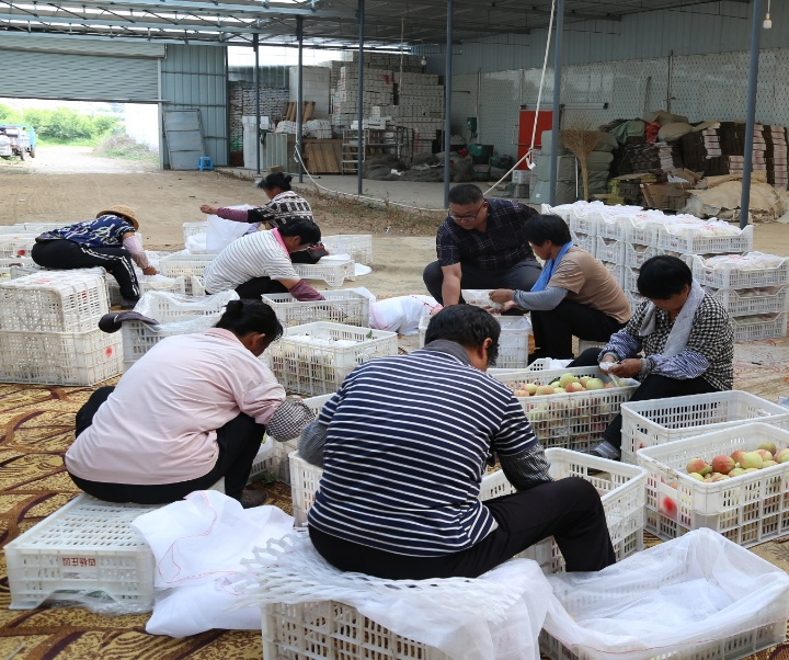殷巷村第一书记张鹏带领村民分拣桃子