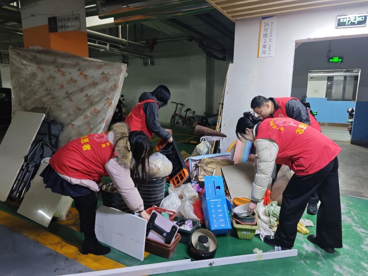 在环境卫生清理活动现场,志愿者携带扫帚、铁锹等工具,对楼道内堆放的生活杂物、废弃垃圾等进行全面清理,大家分工协作搬运、分类处置,确保无卫生死角。